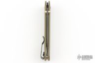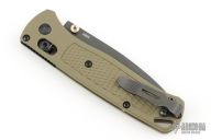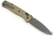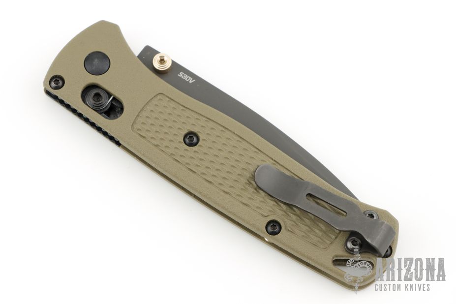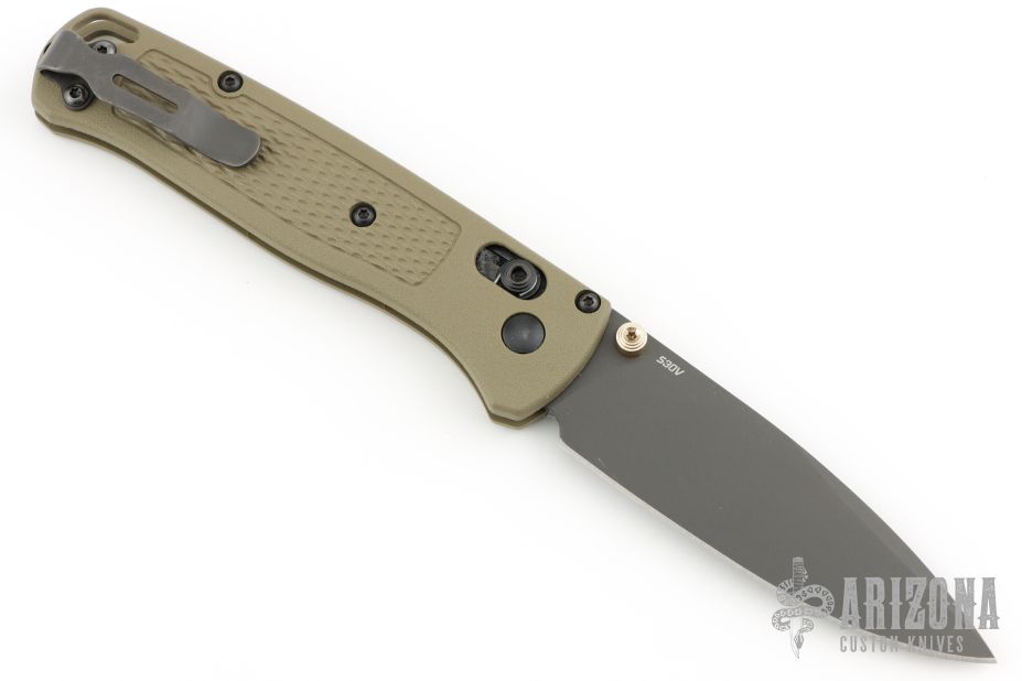 The Benchmade Bugout features a drop point blade with a grey Cerakote finish. It's a manual opener with ambidextrous thumb studs. This AXIS lock has an OD handles with brass spacers and black hardware, a black mini deep-carry pocket clip, and a lanyard hole.  Includes original box, pouch and papers.  Has a few scratches on the blade, otherwise excellent condition.