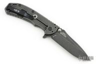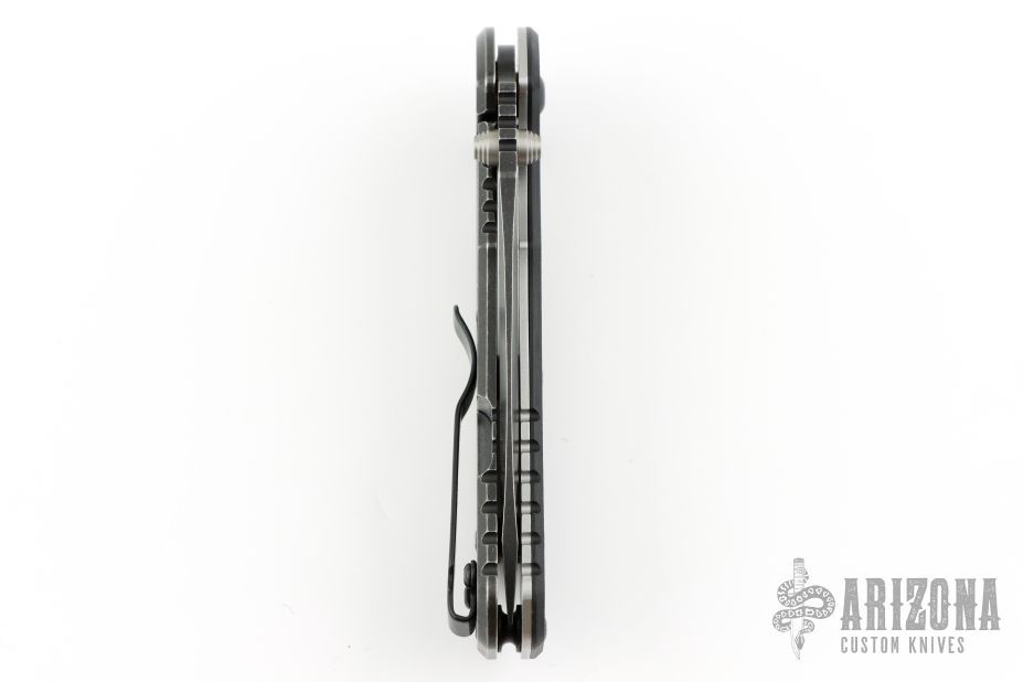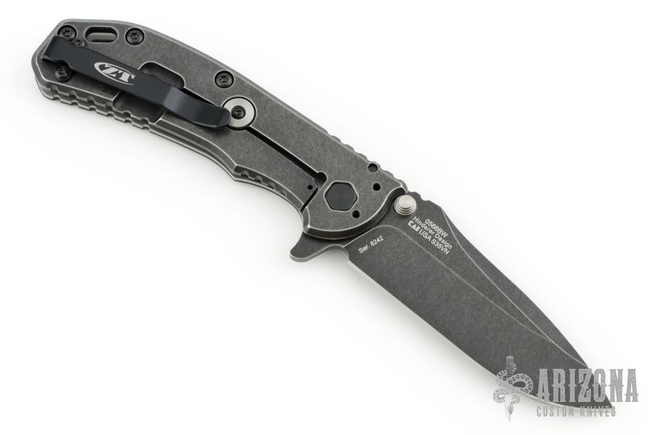 This 0566 Hinder Design Flipper by Zero Tolerance features a black tumble finished drop point blade with swedge, dual thumb studs, notched thumb rest and flipper. The handle is comprised of a black G10 scale over a titanium liner and a black tumbled titanium lockside over black barrel spacers. The black coated steel tip up clip is reversible for right or left hand carry. Lanyard hole in pommel. Excellent condition. Comes with original box and papers.