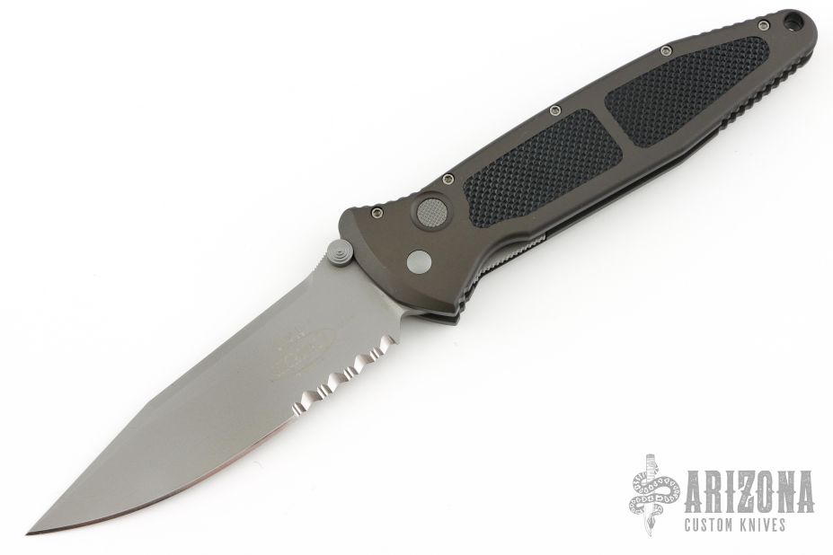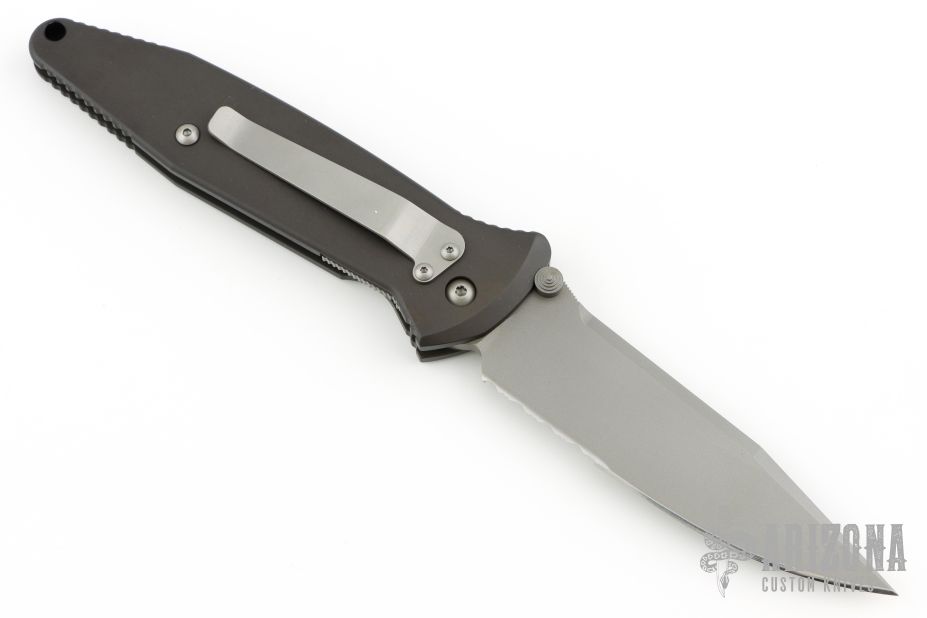 This Socom D/A Auto by Microtech features a bead blasted partially serrated blade with dual thumbstuds and a notched thumbrest.  The handle has a black aluminum frame with non-slip inserts and a tip down stainless steel clip. Dated 1/98. Comes with original box and papers. Excellent condition.