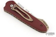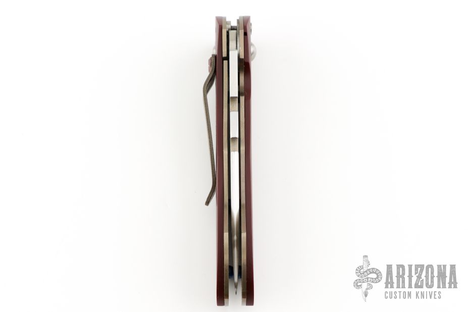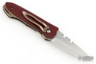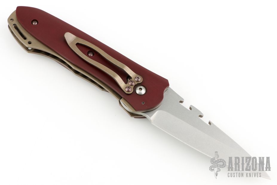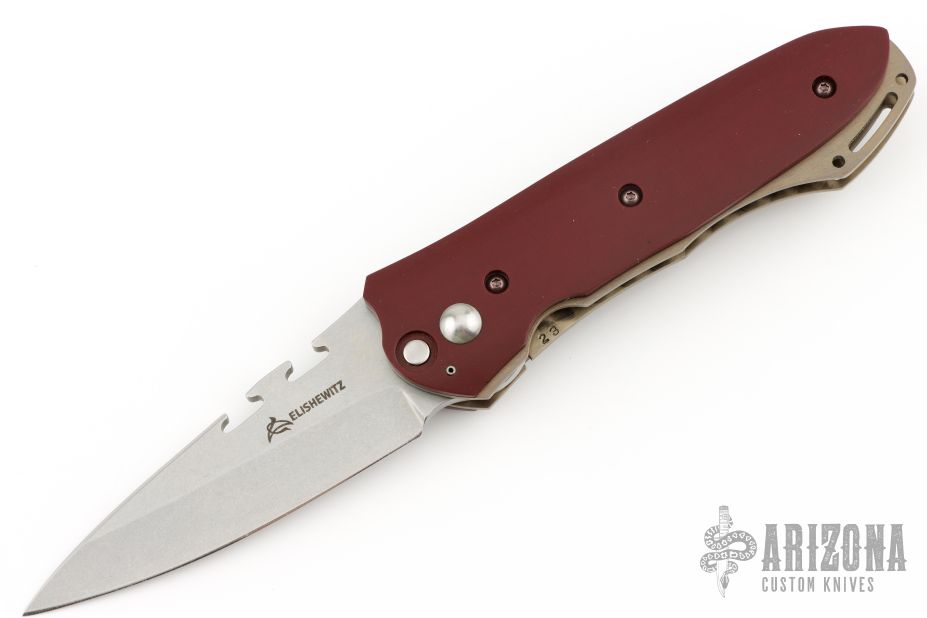 This Linerlock Auto by Allen Elishewitz (stamped #23 on liner at lock) has a stonewashed drop point blade. The handle has red G-10 scales, anodized titanium liners with jeweled interiors, barrel spacers, anodized titanium tip down clip, and slotted lanyard hole. Excellent fit and finish, stong lockup with no blade play, and centered blade. Excellent condition. Comes with a black nylon sheath. Made around 2000 acording to Allen, this model never had a name.