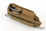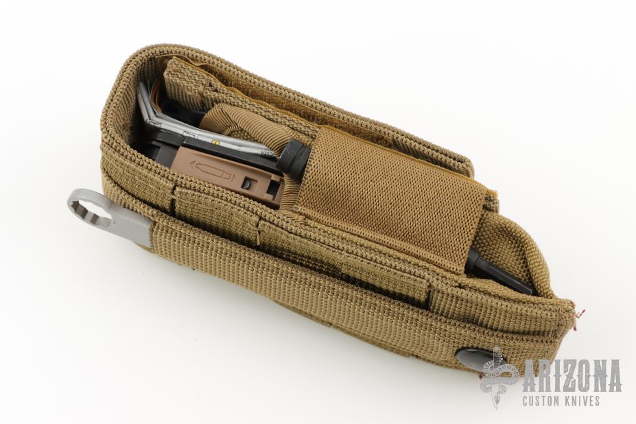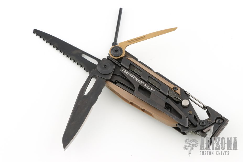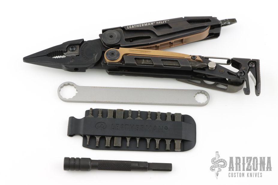 The Leatherman MUT is the first multi-tool that functions as both a tactical and practical tool for military, LE, or civilian shooters. The MUT features multiple areas on the tool threaded for cleaning rods and brushes and all the screwdriver bits are sized for standard military and civilian sighting adjustment work. Also built into the design of the tool is the flexibility to replace the most commonly used parts on the spot, using a simple Torx #8, keeping down-time to a minimum. With all this, a MOLLE sheath and scope adjustment wrench included, the Leatherman MUT may very well be the most efficient and useful piece in your kit. Tools: Needlenose Pliers Regular Pliers 154CM Replaceable Wire Cutters 154CM Replaceable Hard-wire Cutters Stranded-wire Cutters Electrical Crimper 420HC Combo Knife Saw Hammer Replaceable Cutting Hook Bolt Override Tool Replaceable Firearm Disassembly Punch Replaceable Bronze Carbon Scraper #8-32 Cleaning Rod/Brush Adapters Carabiner/Bottle Opener Large Bit Driver (I) Features: One-handed Operable Features Replaceable Titanium Pocket Clip MOLLE Sheath Stainless Steel Black Oxide Version Available 25-Year Warranty BIT KIT: Phillips #1-2 and 3/16 Screwdriver, Phillips #2 and 1/4 Screwdriver, Torx #15 and Hex 7/64 3/8 Wrench and Front Sight Adjustment Measurements: 5 in | 12.7 cm (Closed) 11.2 oz | 317.5 g (Weight) 3 in | 7.62 cm (Blade Length) Has a few light scuffs, otherwise excellent condition. Comes with original sheath, bits and papers.