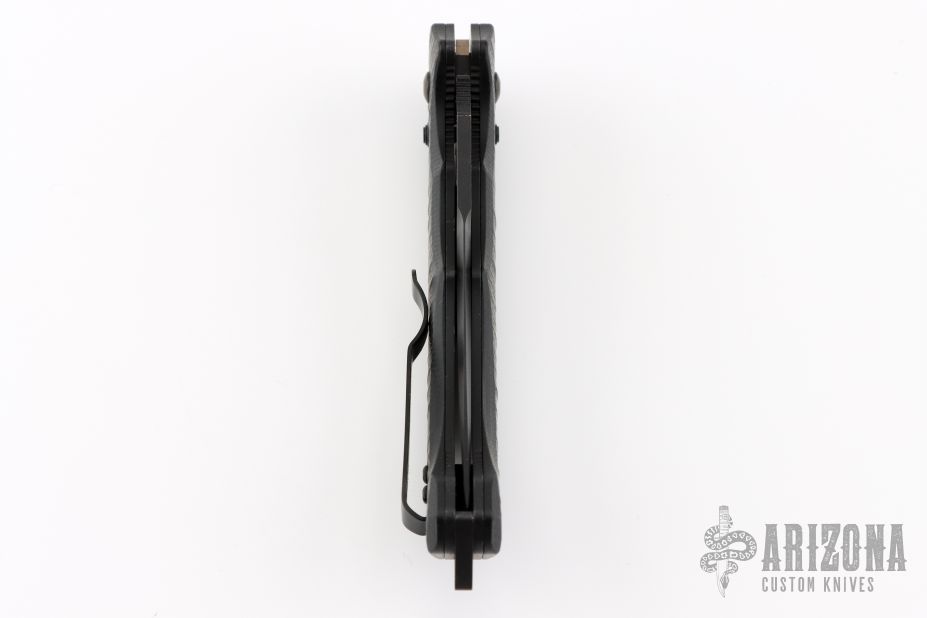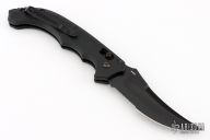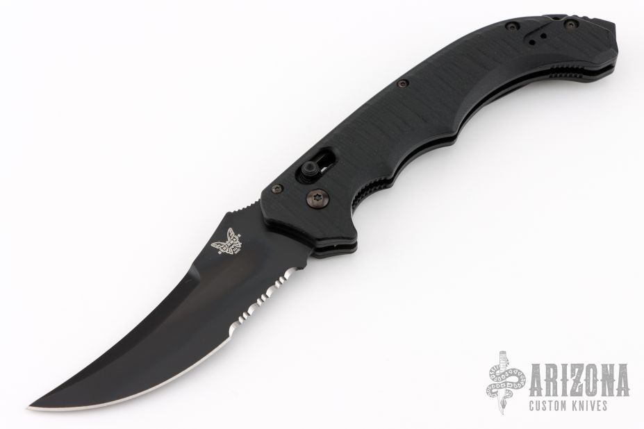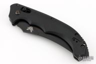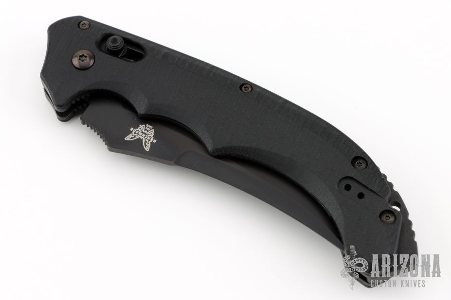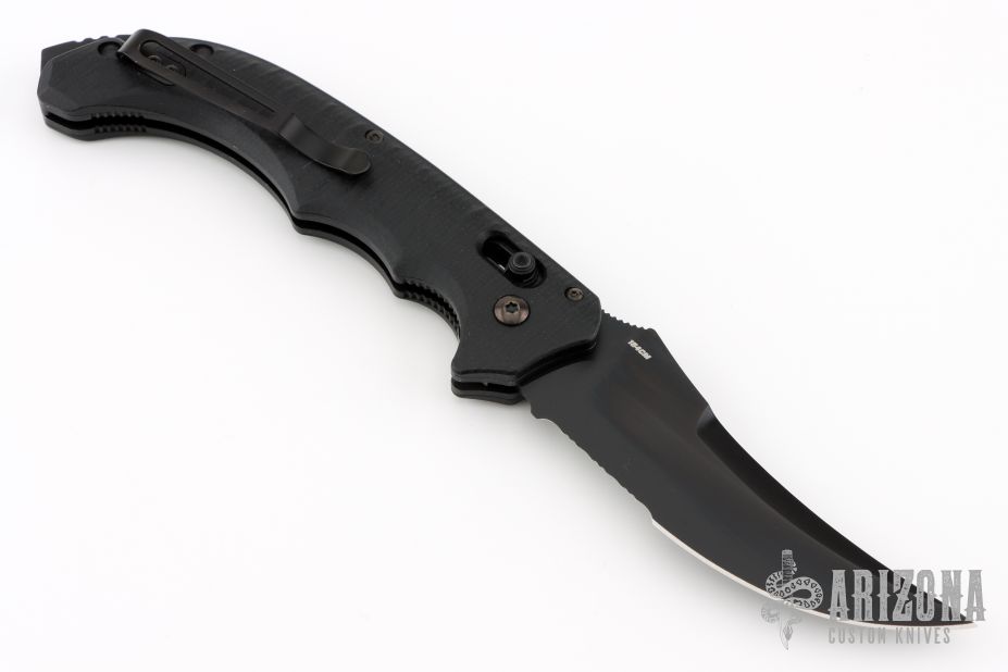 Well-balanced, symmetrical, eye-catching, The Bedlam has a black coated 154CM partially serrated blade that is released with the AXIS locking button.  Safety on top of knife. Sculpted black G10 handle fits comfortably and securely. Reversible tip up black clip. Comes with original box, pouch and papers. Excellent condition.