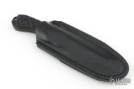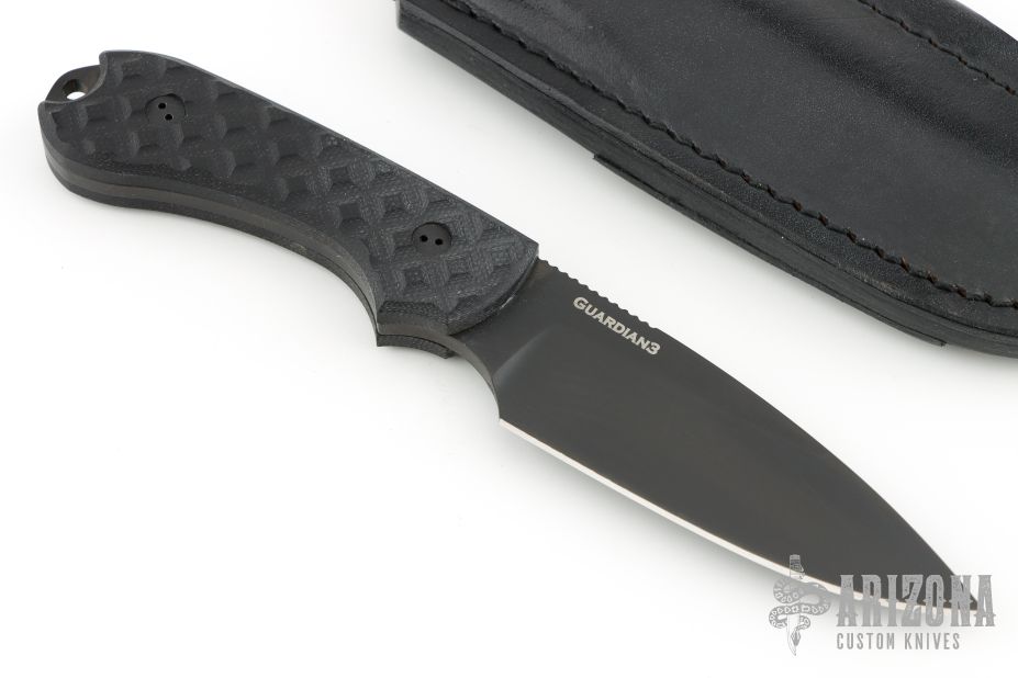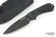 This Guardian3 by Bradford Knives features a black drop point blade with notched thumbrest, .142" blade stock and 1.109" blade depth, full tang construction. The handle has black G-10 scales. Exposed tang pommel with lanyard hole. Includes a black leather sheath. Has a couple light scuffs, otherwise excellent condition.