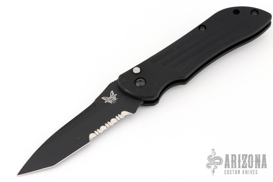 This 9100SBK by Benchmade features a black coated tanto blade with false top edge, partial serrations and a notched thumbrest. The handle is black aluminum with a black tip up stainless steel clip. Comes with box and papers. Excellent condition.