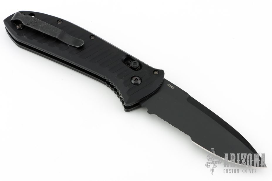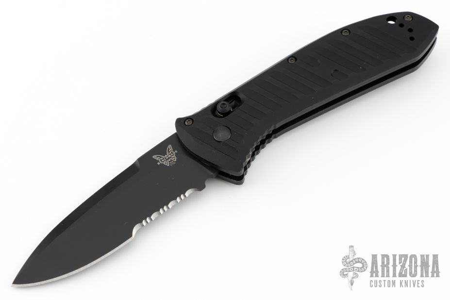 This automatic Presidio II model sports a black aluminum handle and a black finished blade with a partially serrated edge. Benchmade has updated their legendary Presidio model with significant ergonomic and performance upgrades. This combat legend has a black anodized 6061-T4 billet aluminum handle with Benchmade's AXIS lock system for effortless one-handed opening and closing. Milled grooves in the handle improve grip while adding a modern flair to the design. The Presidio II has a slightly larger blade and handle that is built to perform well as a tactical or everyday carry knife. Item includes a Cordura sheath with snap retention and a Malice Clip. 6061-T6 billet aluminum handle offers a tough build without weighing you down. Dual thumb studs, reversible pocket clip, and an AXIS® lock mechanism provide a fully ambidextrous design. Blade is made from CPM-S30V steel for maximized strength and cutting performance.