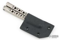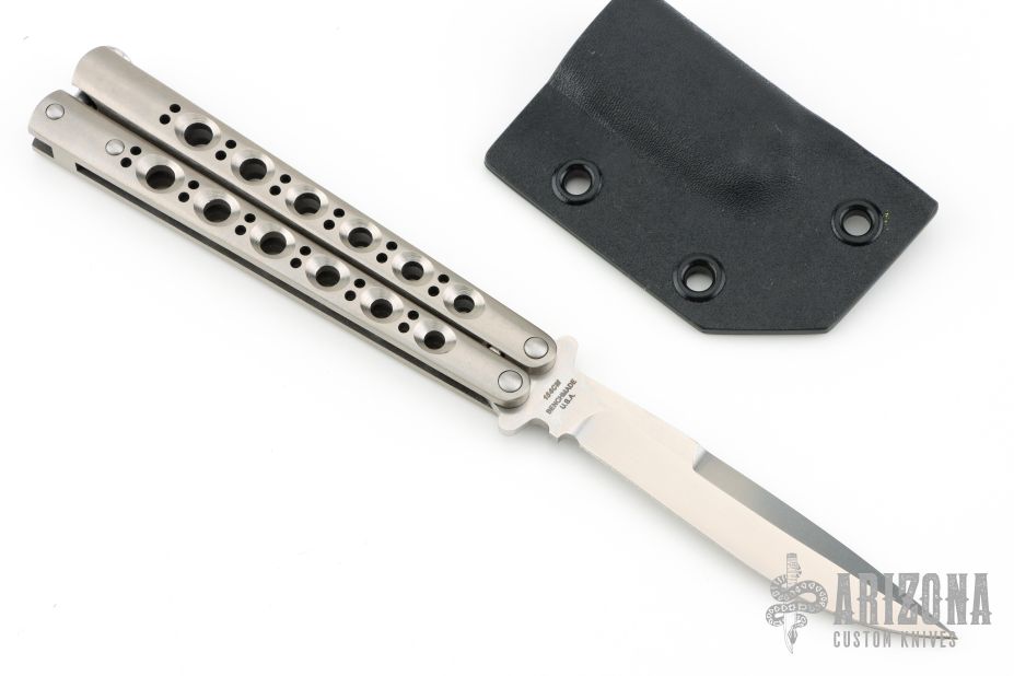 This Model 42 by Benchmade features a satin finished blade. The handles are satin finished titanium with spring-latch. Comes with original box, papers, and BM nylon belt sheath. Listing also includes a Kydex neck sheath. Excellent condition.