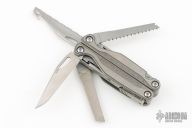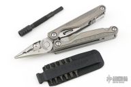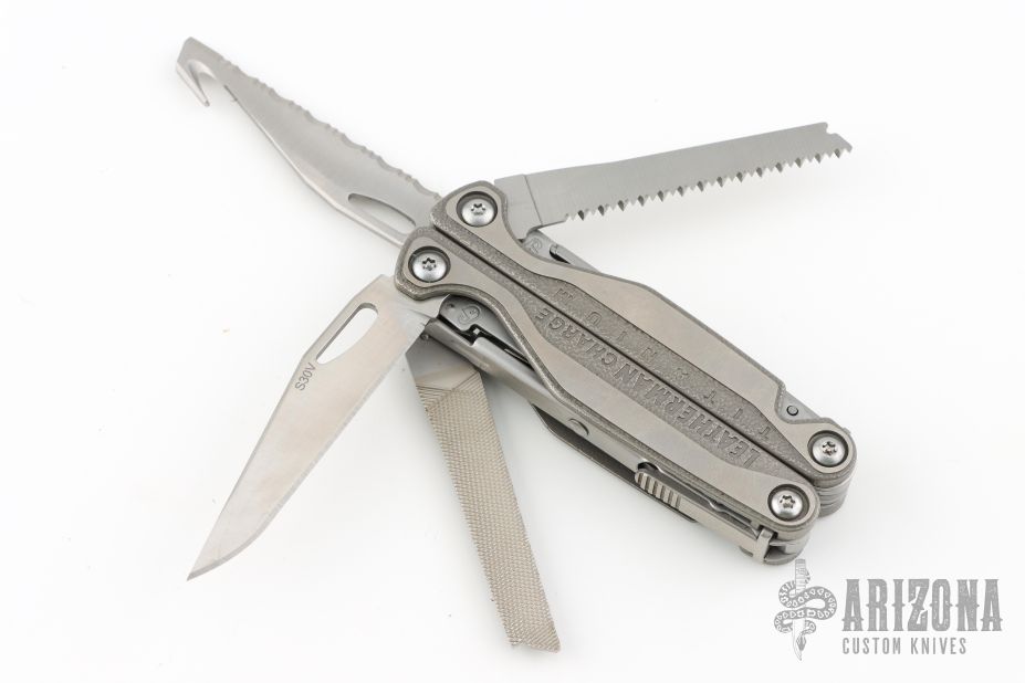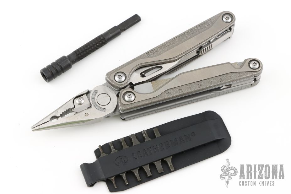Leatherman Charge TTi Features: Needlenose Pliers Regular Pliers Wire Cutters Hard-Wire Cutters Crimper Clip-Point Knife Serrated knife Cutting Hook Saw Metal/wood File Diamond-coated File Scissors Large Screwdriver Large Bit Driver Small Bit Driver Ruler (8"/19cm) Bottle/Can Opener Wire Stripper Lanyard Ring.