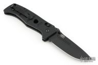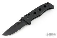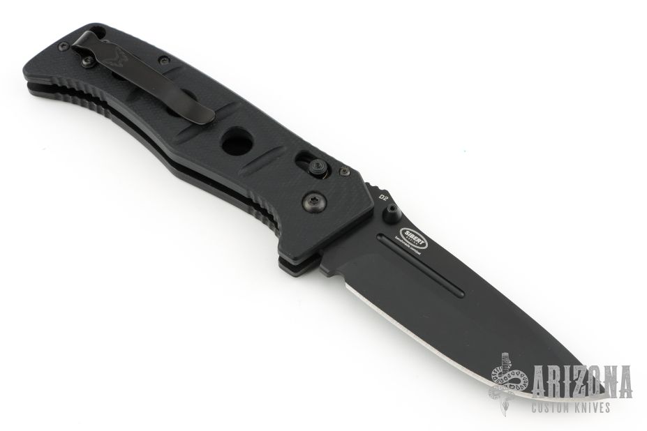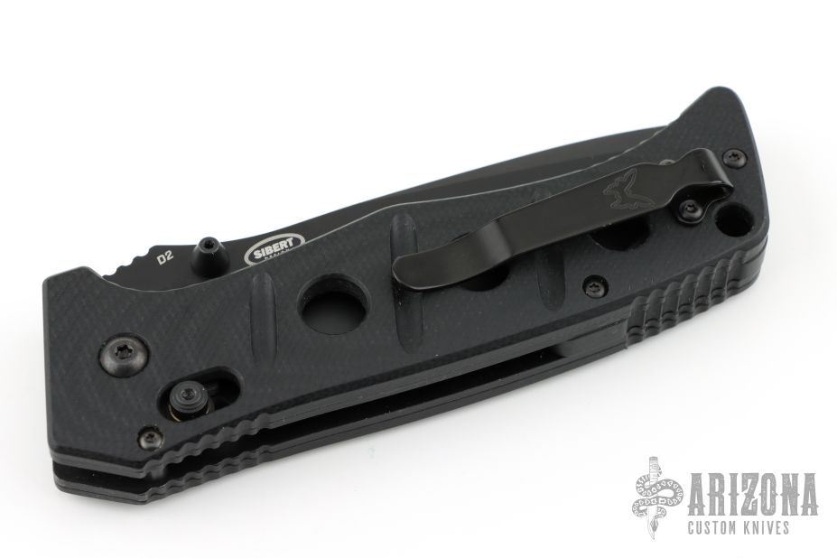 This Siebert designed 275 Adamas Axis Lock has a black D2 stainless steel drop point blade with blood grooves and notched thumb rest. Handle is black G10 over black stainless steel liners.  No pocket clip. Comes with original sheath. Excellent condition.