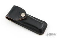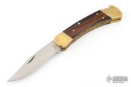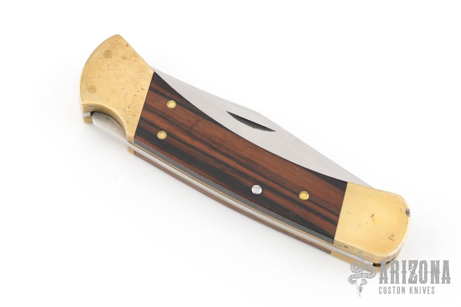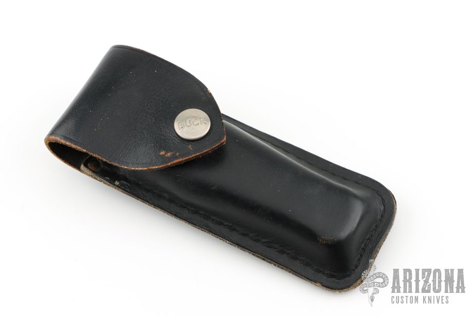 This vintage Buck 110 "folding hunter" features a satin finished clip point blade with nail nick. It has wood scales, brass bolsters and frame. Comes with original black leather sheath. Has some patina and scratches, has been resharpened, has a small chip out of the blade, good condition otherwise.