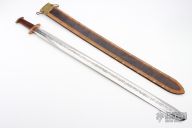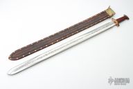 This Reproduction Viking Sword by Randal Graham of Dragon Fist Forge features a hand forged double edged blade with hammer marked flats, .248" blade stock and 1.833" blade depth, hidden tang construction. The handle has a multipiece guard and butt consisting of hammered copper, silver alloy and bronze. The handle is bloodwood and has been free hand carved by the maker. The tang goes through the handle and is hand peened at the butt. This sword was made entirely with hand tools and by eye, it was forged, finished with files and stones, and all of the other parts and pieces were made with a saw, chisels and stones. Comes with a brown leather sheath with copper rivets, brass throat and twisted copper rings that have been silver soldered. Comes with a wooden box, COA, a letter from the maker, and a Customs Information form dated May 22, 1998. Excellent condition. Also comes with a clipping of a newspaper article where he is working on this very sword.