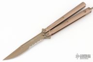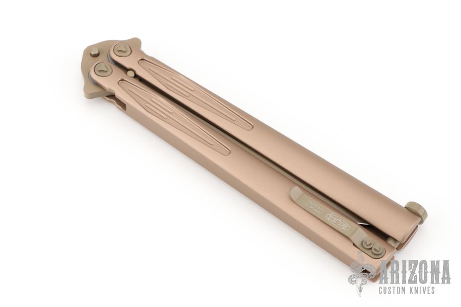 This Tachyon III balisong by Marfione Custom Knives has a black clip point partially serrated blade with false top edge. The handles are tan aluminum with spring latch and tip up pocket clip, black hardware. Rides on bearings, no blade play, very smooth. S/N 02745 and dated 10/2017. Comes with the wrong MT box with papers. Box is beat up. Excellent condition.