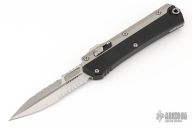 This Glykon by Microtech features a stonewashed double edged fully serrated blade with fullers and notched thumbrest. The handle has a black aluminum chassis with bead blasted titanium overlays and tip down clip. Comes with original box and papers. Excellent condition. Dated 06/2023 and #1863