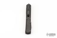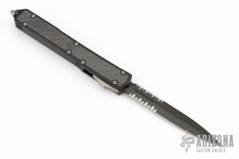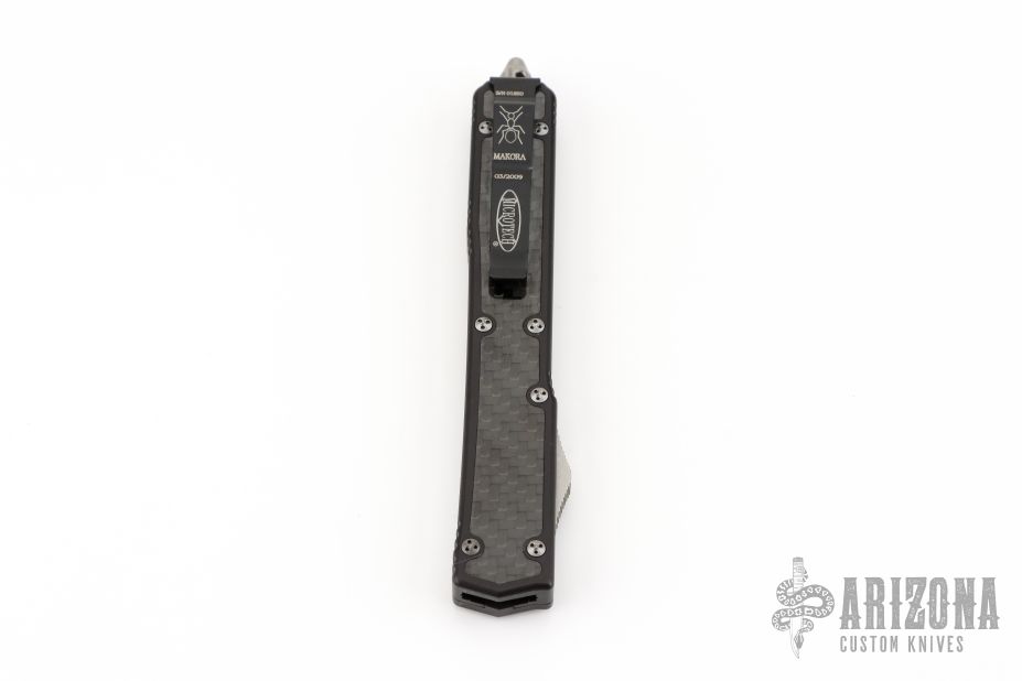 This Makora II OTF automatic by Microtech features a black double edge partially serrated blade and carbon fiber inserts on both sides of the black aluminum handle. Dated 03/2009 and serial number 01850. Comes with original box and papers. Excellent condition.
