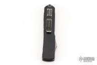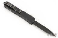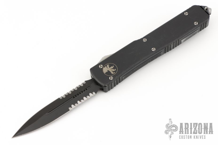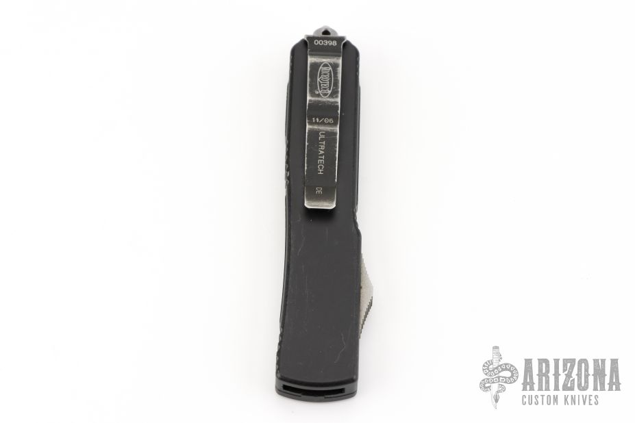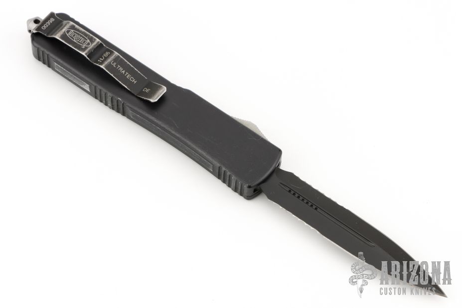 This Ultratech OTF automatic by Microtech Knives features a double edged black partially serrated blade and a black aluminum handle. Black stainless steel clip. #00398 and dated 11/06. Includes original box, nylon sheath and papers. Has some scuffs and scratches good condition otherwise.