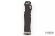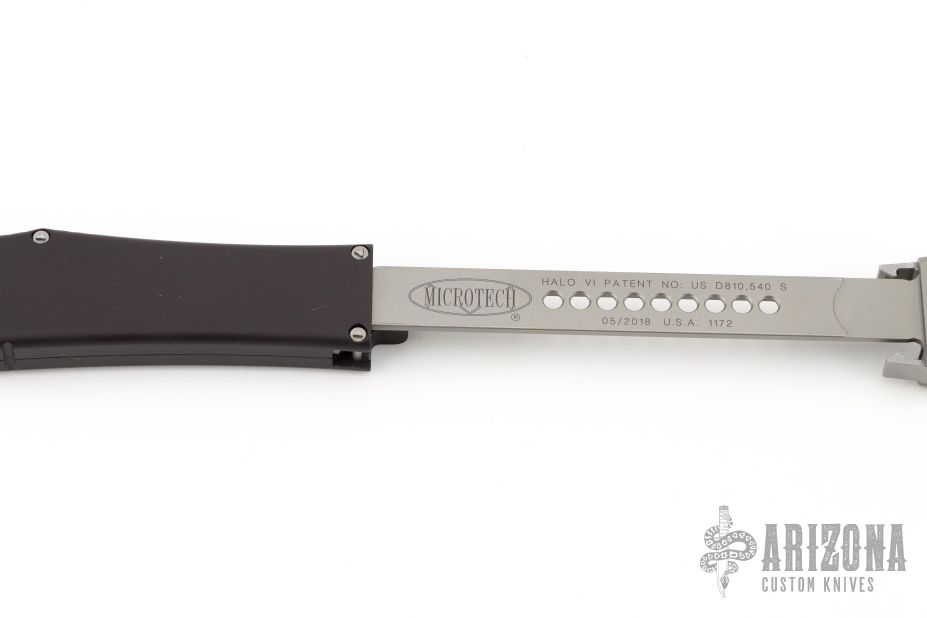 This Halo VI by Microtech knives features a black drop point blade with fullers and satin flats. The handle has a black aluminum frame with blasted stainless steel hardware and charging handle. Dated 05/2018 and #1172. Comes with original box and papers. Excellent condition.