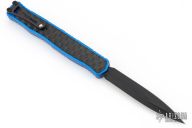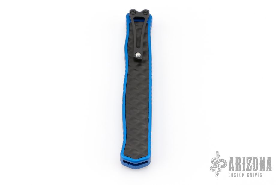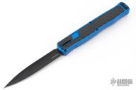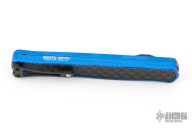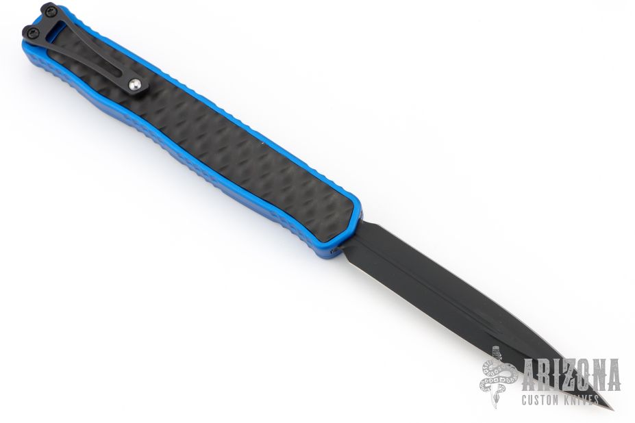 This Cleric II OTF by Heretic Knives features a black double edged Magnacut blade. The handle has a blue aluminum frame with black bubble inlays, DLC titanium tip down clip. Comes with original box and lube. Excellent condition.