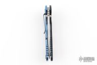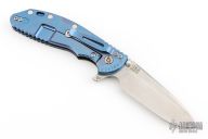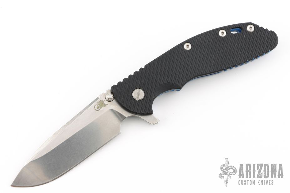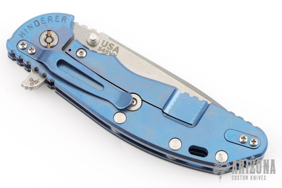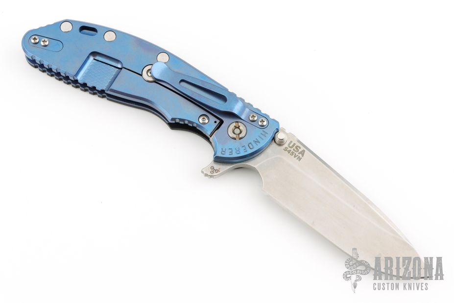 This XM-24 from Hinderer Knives features a stonewashed blade with swedge, dual thumb studs, notched thumb rest and flipper. The handle has a black G-10 scale with a titanium liner on the "A" side and a tumbled and anodized titanium lockside, pocket clip, hardware and lock bar stabilizer, and lanyard hole in pommel. Includes the original box and extra hardware. Excellent condition.