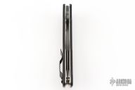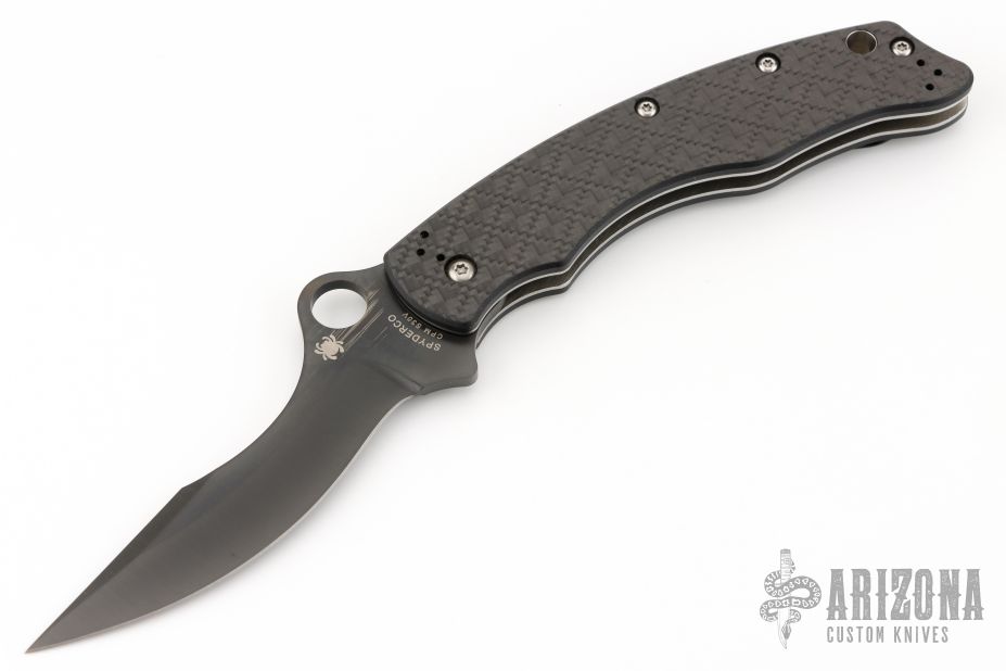 This Laci Szabo folder has a black scimitar shaped blade maximizes cutting power yet has a well centered blade to support point-oriented tactics. The large size is intimidating. The handle scales are a striking G10 that simulates carbon fiber. Unusual top facing liner lock. Comes in original box and papers. Has some light scratches, excellent condition otherwise.