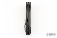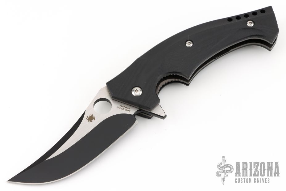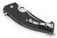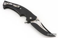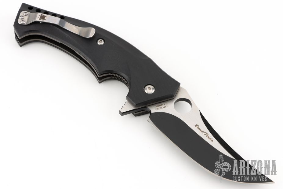 This Mamba flipper is a Walter Brend and Joel Pirela design executed by Spyderco. It features a two tone blade with satin finish flats and black grinds. Notches on blade spine and spine of handle. Carbon Fiber scales, bead blasted titanium liners, black G-10 backspacer, and a tip up stainless steel clip. Smooth function with a nice lock, detent and blade seating dead center. Hidden lanyard pin at the butt. Comes with a padded and zippered Spyderco case. Excellent condition.
