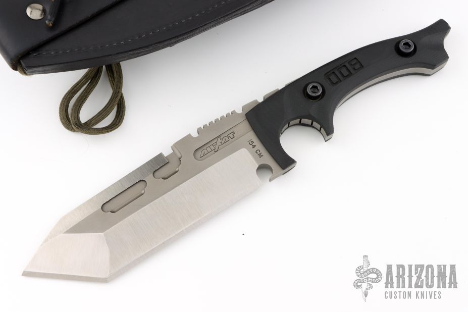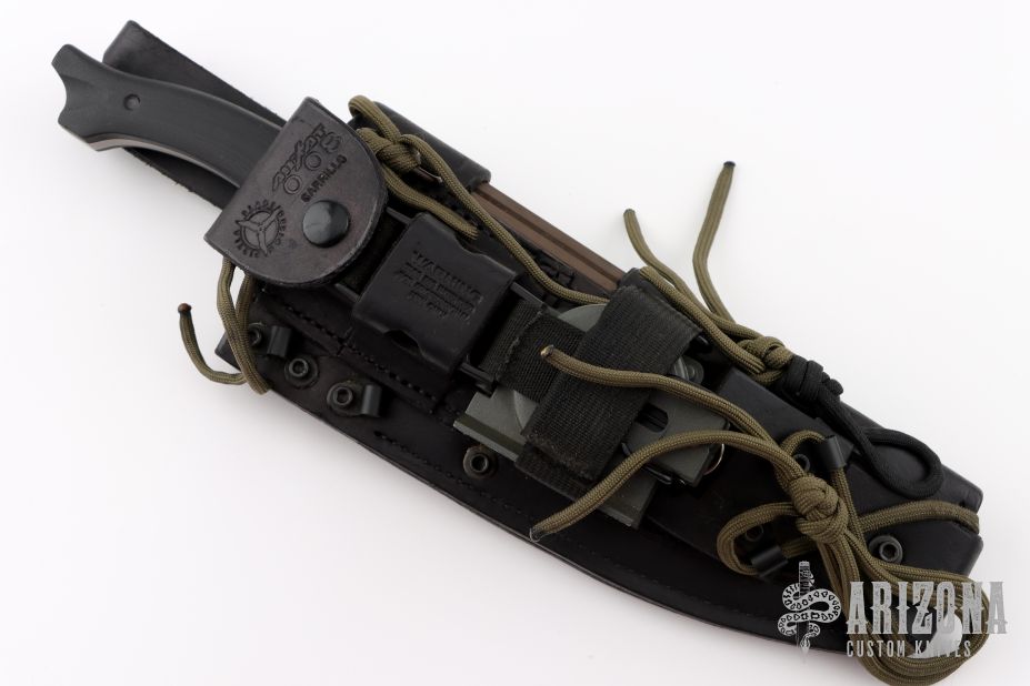 This AirKat Apache from Dwaine Carrillo is a Joel Pirella Design, it features a satin finished blade with sharpened top edge and notched thumbramp, .253" blade stock and 2.047" blade depth, full tang construction. The handle is comprised of black G10 scales. Lanyard hole in pommel with lanyard. Excellent condition. Comes with a black leather sheath with compass and sharpening stone.