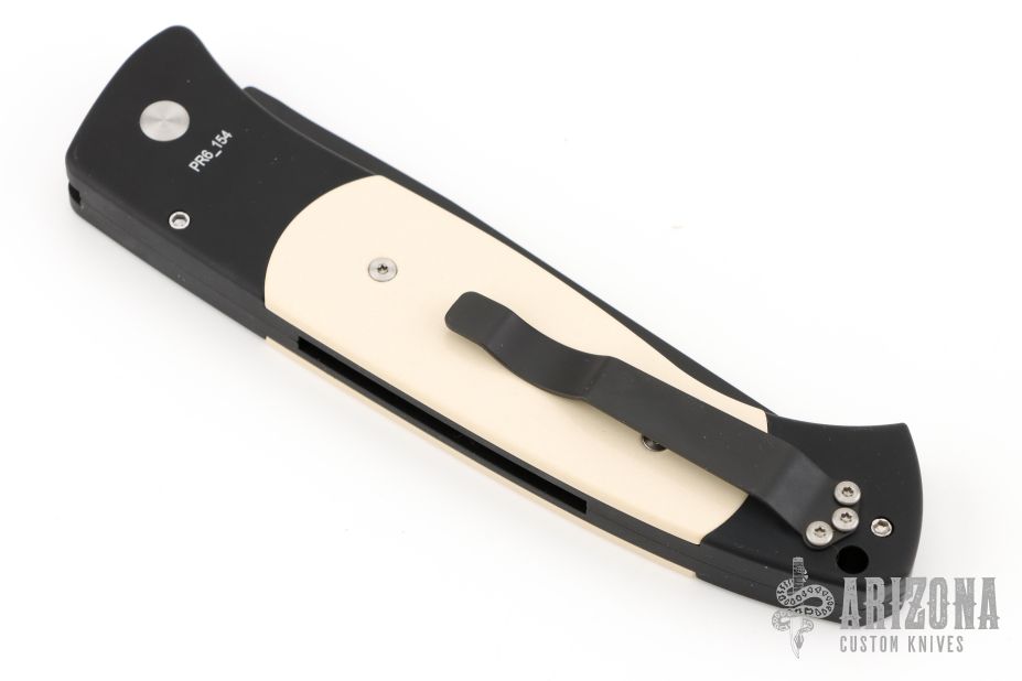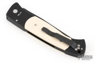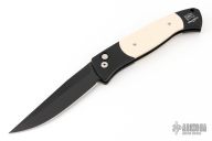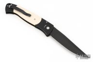 The Brend Auto by Pro-Tech Knives features Walter Brend's famous "Model 1" blade shape in a small package. Coil spring side-opening automatic. It has a black finished blade and black aluminum handle with ivory micarta inlays, tip up black stainless steel clip. Comes with original box, papers, and nylon belt sheath. Excellent condition. PR6 #154