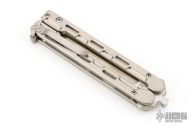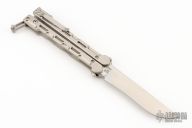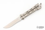 This QBS-2 Marty McFly from QTRMSTR features a satin finish recurve style blade. The handles are comprised of machined and skeletonized titanium with a matching tip up pocket clip and titanium T latch. Features the patented "BladExchange" pivot with allows you to switch between a Tanto edge or Tanto trainer blade (included) with the push of a button. Includes original box, tool, trainer, and makers card dated 8-31-15. Numbered 261 of 300. Light scratches are visible on the handle otherwise the knife is in Excellent Condition.