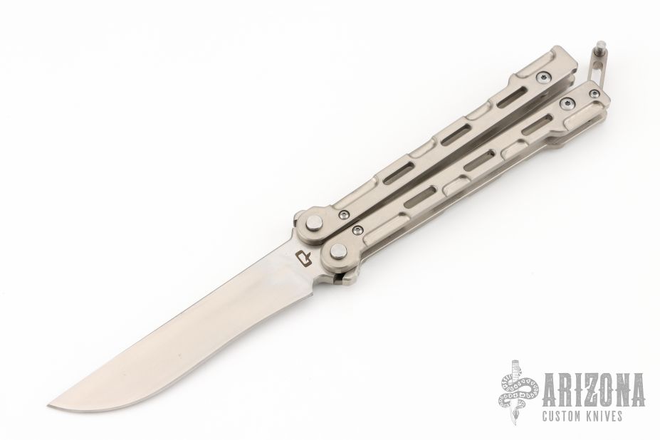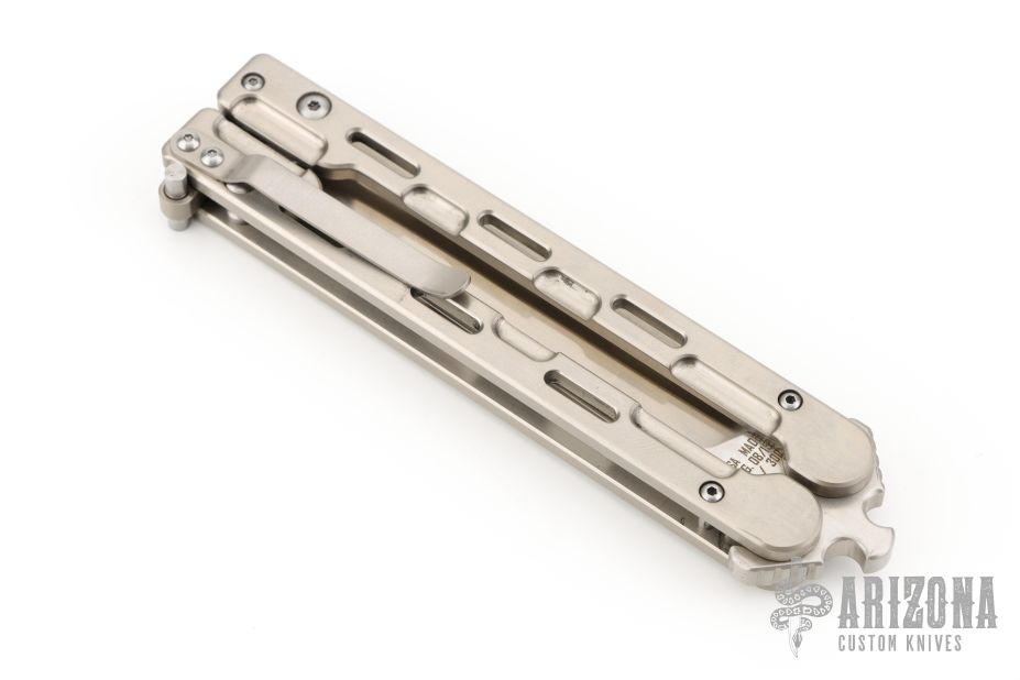 This QBS-2 Marty McFly from QTRMSTR features a satin finish recurve style blade. The handles are comprised of machined and skeletonized titanium with a matching tip up pocket clip and titanium T latch. Features the patented "BladExchange" pivot with allows you to switch between a Tanto edge or Tanto trainer blade (included) with the push of a button. Includes original box, tool, trainer, and makers card dated 8-31-15. Numbered 261 of 300. Light scratches are visible on the handle otherwise the knife is in Excellent Condition.