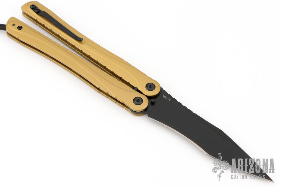 This Balisong from Brous Blades features a black finished clip point recurve blade with notched thumbrest. The handle is comprised of a gold finished stainless steel frame over barrel spacers, stainless steel tip up pocket clip. Numbered #185/200. Includes padded vault style case and COA. Excellent condition.