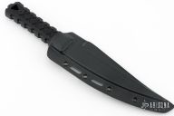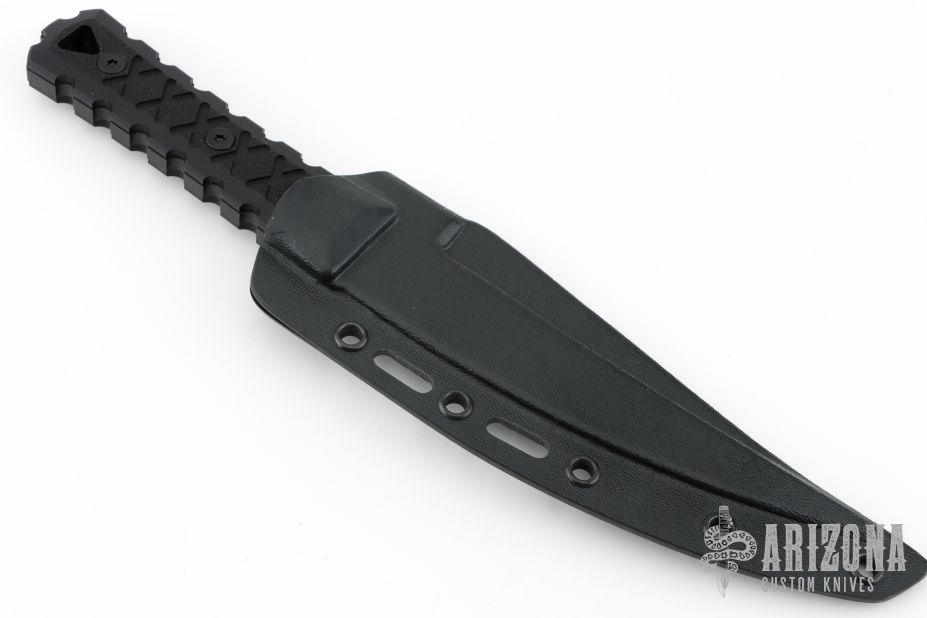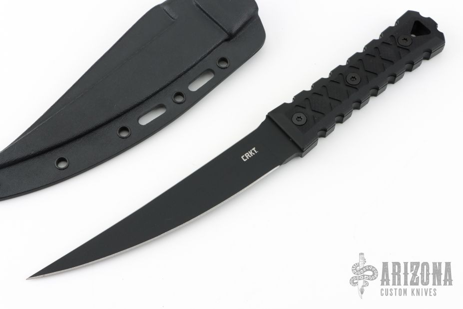 This HZ6 by CRKT is a Williams Blades design, it has a black upswept blade with notched thumb ramp, .212" blade stock and 1.25" blade depth, full tang construction. The handle has textured g10 covers with lanyard bail in pommel. Comes with a black sheath and original box. Excellent condition.