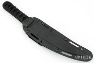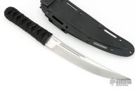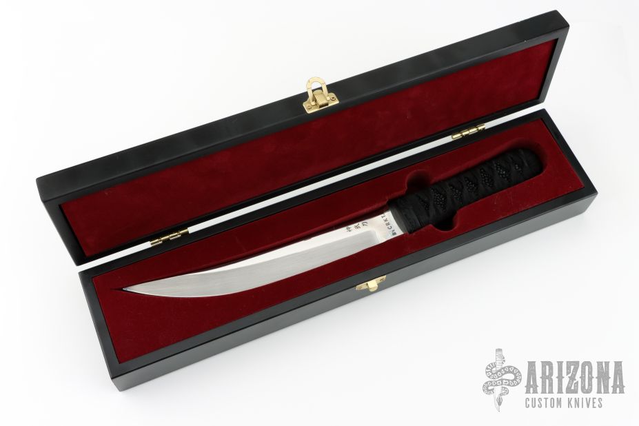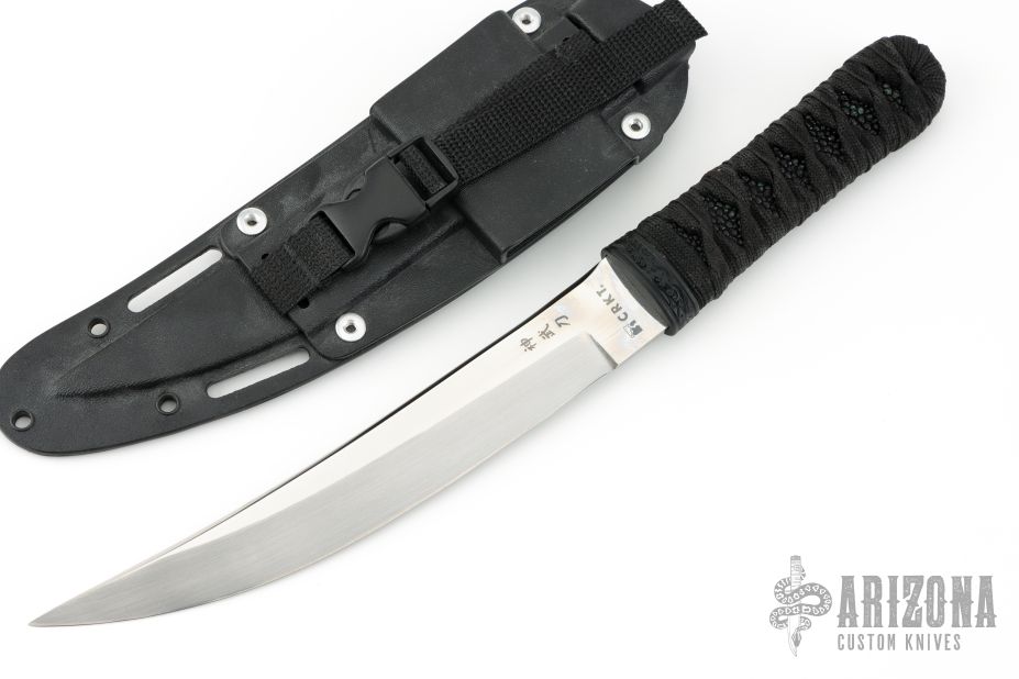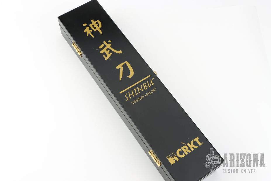 The Shinbu from CRKT features an upswept two-tone blade with polished flats and hand rub satin grinds. The handle is comprised of a decorative spacers and Japanese style wrap over black leather and hidden tang construction. Includes kydex sheath and wood presentation box. Has a couple marks on the b-side of the blade, otherwise excellent condition. .23" blade stock and 1.303" blade depth.