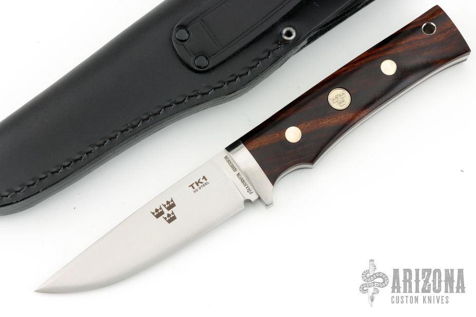 This TK1L by Fallkniven features a satin finished laminated steel blade, .174" blade stock and 1.028" blade depth, full tang construction. The handle has a nickel silver guard, wood scales and a lanyard hole. Comes with a black leather sheath and original box. Excellent condition. Blade Steel: 3G Steel