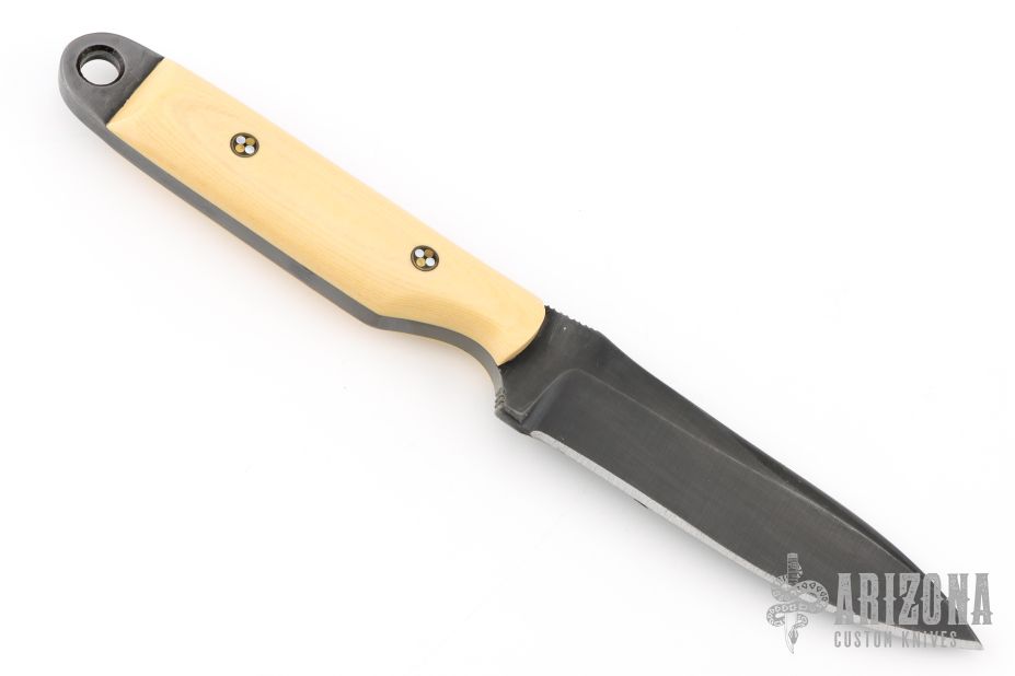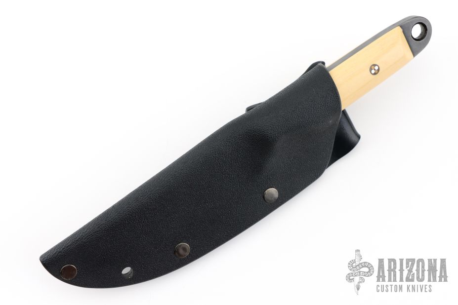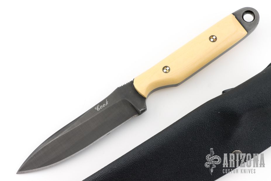 This knife by Dennis Cook features a black finished drop point blade with notched thumb and finger rests, full tang construction with blade thickness of .198" and depth of .934". The handle has pinned vintage paper micarta covers with lanyard hole in pommel. Comes with kydex sheath. Has a couple light scuffs, otherwise Excellent condition.