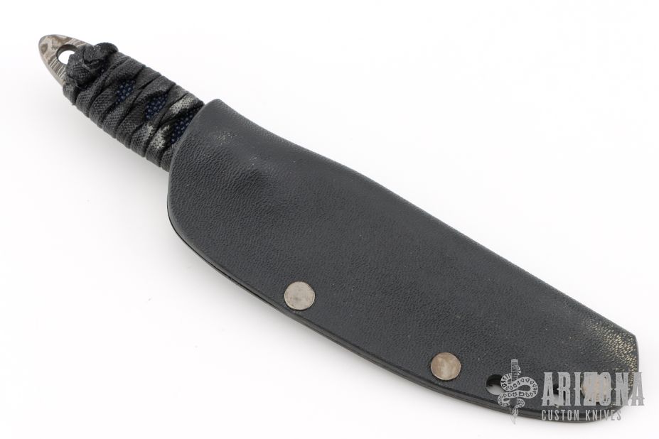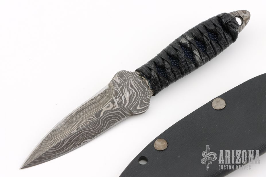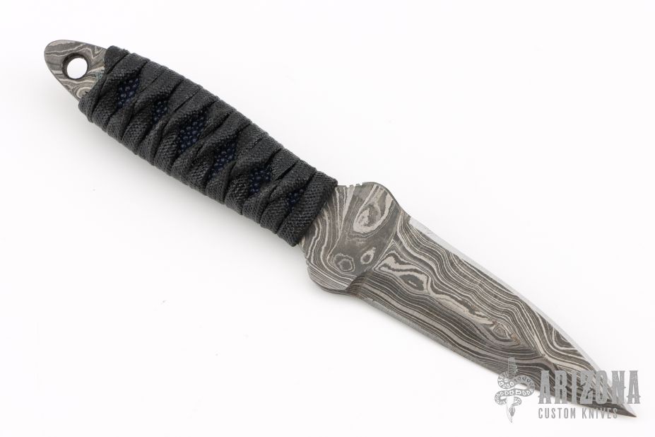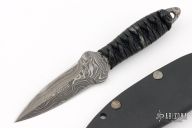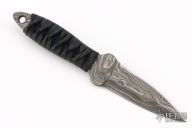 This neck knife by Lynn Dawson features a Damascus blade with notched thumbrest, .141" blade stock and .820" blade depth, full tang construction. The handle has epoxied cord wrap. Comes with a kydex neck sheath. Excellent condition.