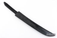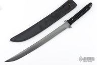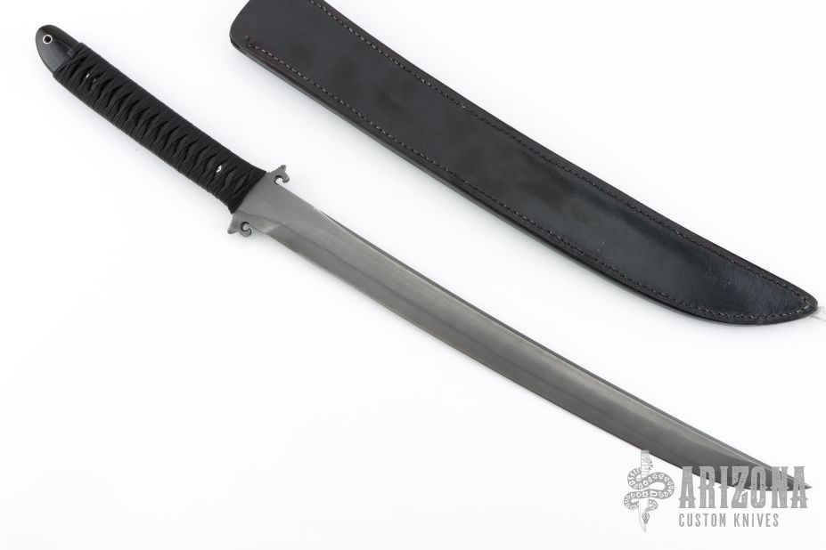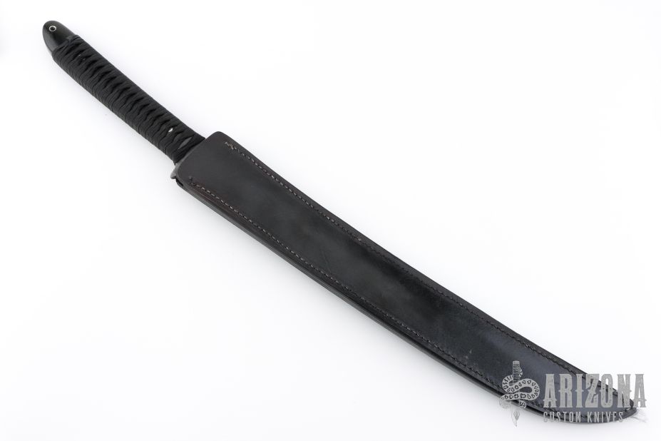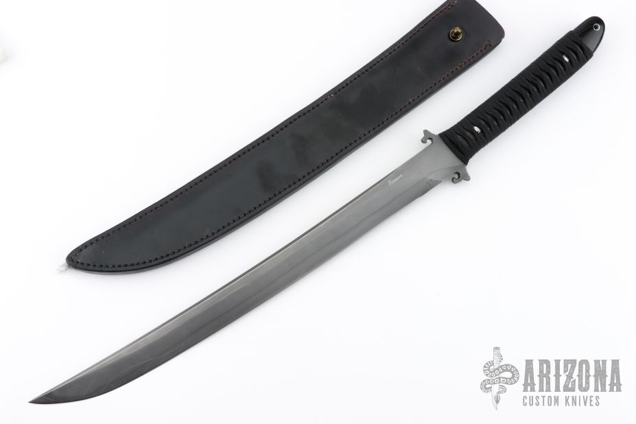 This Combat Sword by Barry Dawson features an upswept blade with nice hamon and false top edge, .254" blade stock and 1.277" blade depth, full tang construction. The handle is comprised of black paracord Japanese style wrap over black canvas micarta scales with mosaic pins. Includes leather sheath. Has some scratches on the blade, good condition otherwise.