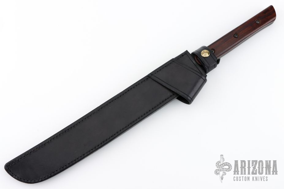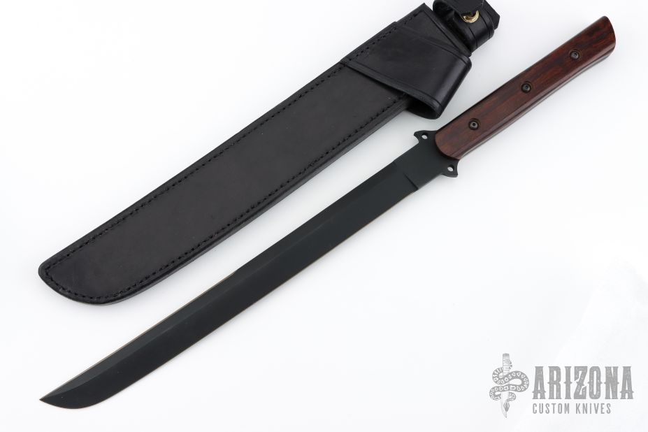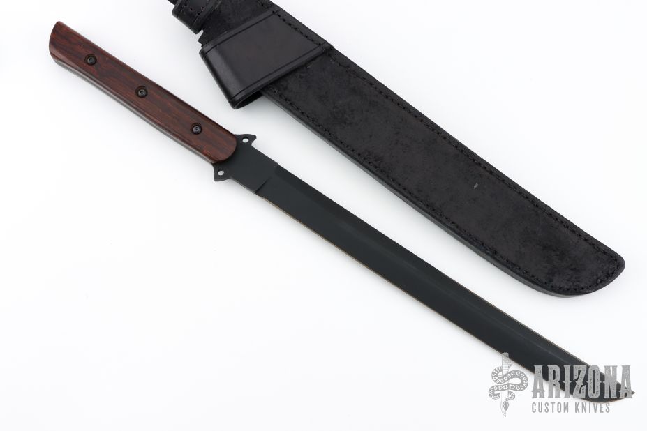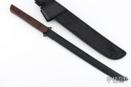 This Short Sword features a black blade with top edge, .251" blade stock and 1.195" blade depth, full tang construction. The handle has walnut scales. Comes with a black leather sheath with belt loop. Has a couple light scratches, otherwise Excellent condition.