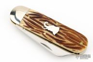 The Great Eastern Cutlery Toe Nail Clipper knife has a satin finished blade with nail nick. The handle has nickel silver bolsters, India Jigged Bone covers, nickel silver elephant escutcheon, brass liners and steel spring. Excellent condition. Comes with original tube.