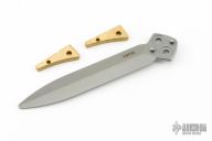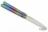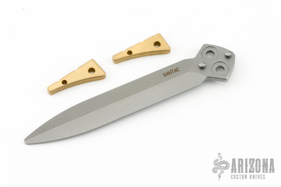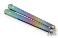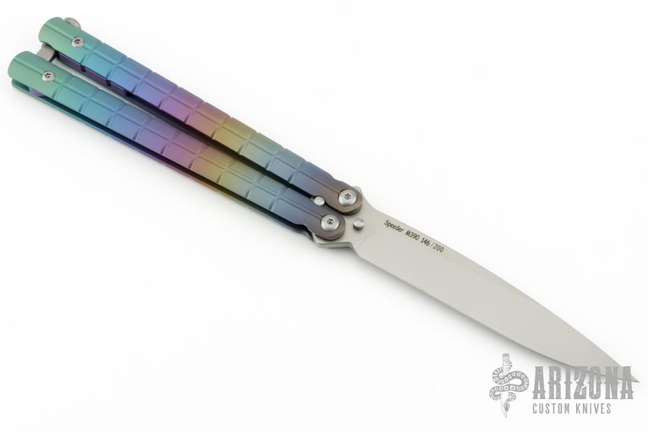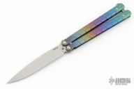 This knife features a bead blasted drop point blade. The handle has a milled and anodized titanium frame with a bead blasted T-latch.  Includes a bead blasted trainer blade, the original box, papers and extra hardware. Listing also includes a kydex neck sheath. Has a couple light marks on the body, excellent condition otherwise.