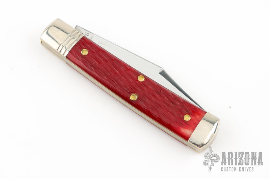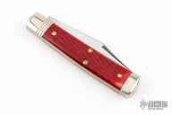 This slipjoint by Northfield Knives/Great Eastern Cutlery features a mirror finished blade with nail nick. The handle has nickel silver bolsters and butt, garnet jigged bone covers, brass liners, and a steel spring. Has half-stop. Comes with original tube. Excellent condition.