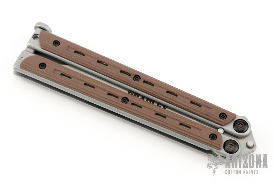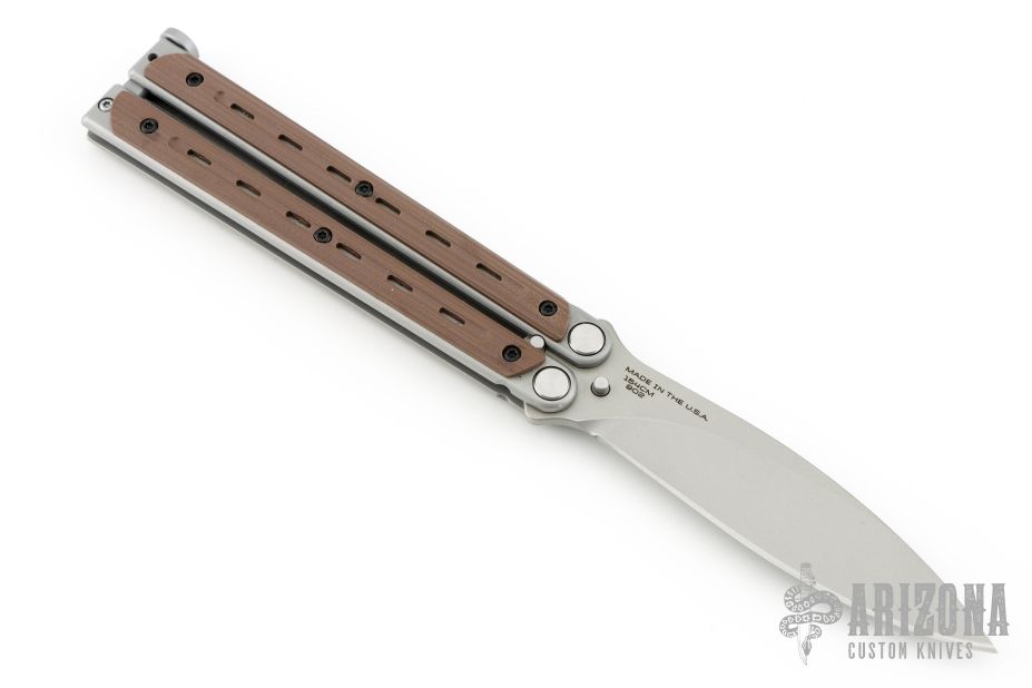 This Kimura 9 Balisong by Bradley Cutlery has a bead blasted drop point blade. The handles are bead blasted stainless steel with brown G-10 overlays, T-latch at the butt. Latch can be reversed. Comes with original box, excellent condition.