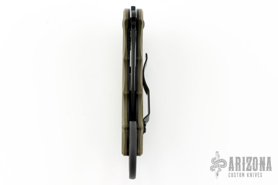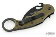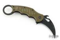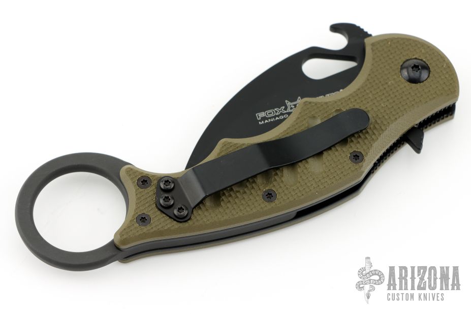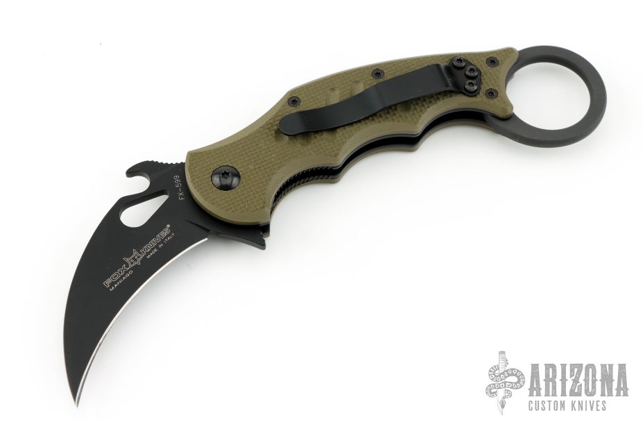 This folding Karambit by Fox Cutlery features a black hawkbill blade with thumbhole, notched thumbrest and wave feature. The handle has green G-10 scales, black stainless steel liners and backspacer. Tip up left or right reversible stainless steel clip. Comes with original box, papers, and extra clip/hardware. Excellent condition.