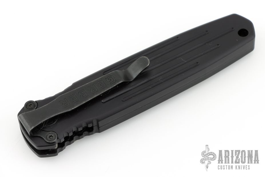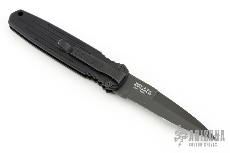 This Covert Auto by Gerber features a black spear-point partially serrated blade a notched thumbrest. Has a black aluminum handle with a and safety. Black stainless steel clip, tip down clip. Includes the original box, papers, and pouch. Has scuffs on the clip. Excellent condition.