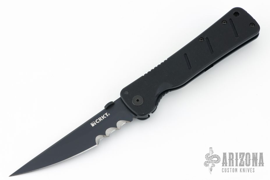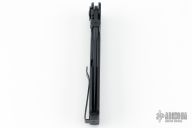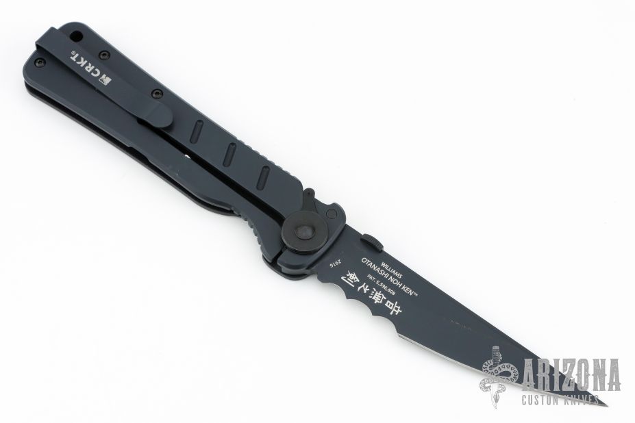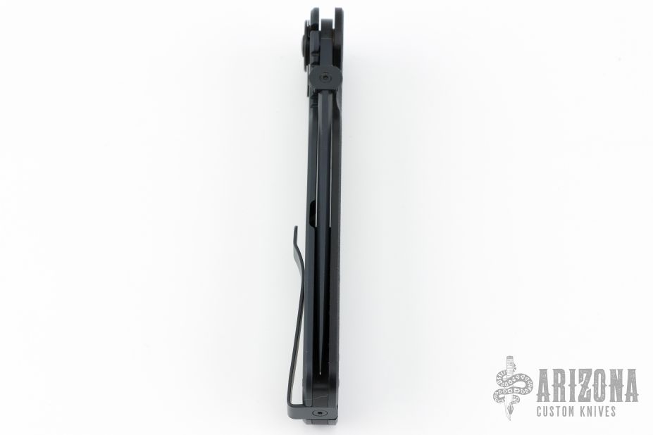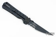 This Williams Otanashi noh Ken Framelock Folder has a black finished AUS-8 upswept blade with thumb disk and serr. Handle is black G10 and black finished stainless steel with reversible tip-up clip, landyard hole, and black fiber backspacer. By moving a thumb button at pivot thumbrest, this knife becomes a fixed blade by locking the lockbar onto the tang. Centered blade, excellent lockup and detent. This is an extremely robust folder with a very slim profile. Makes for a great larger-than-average EDC piece. Comes with original box and papers. Excellent condition.