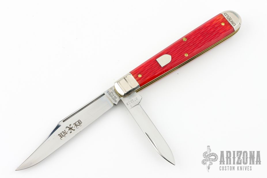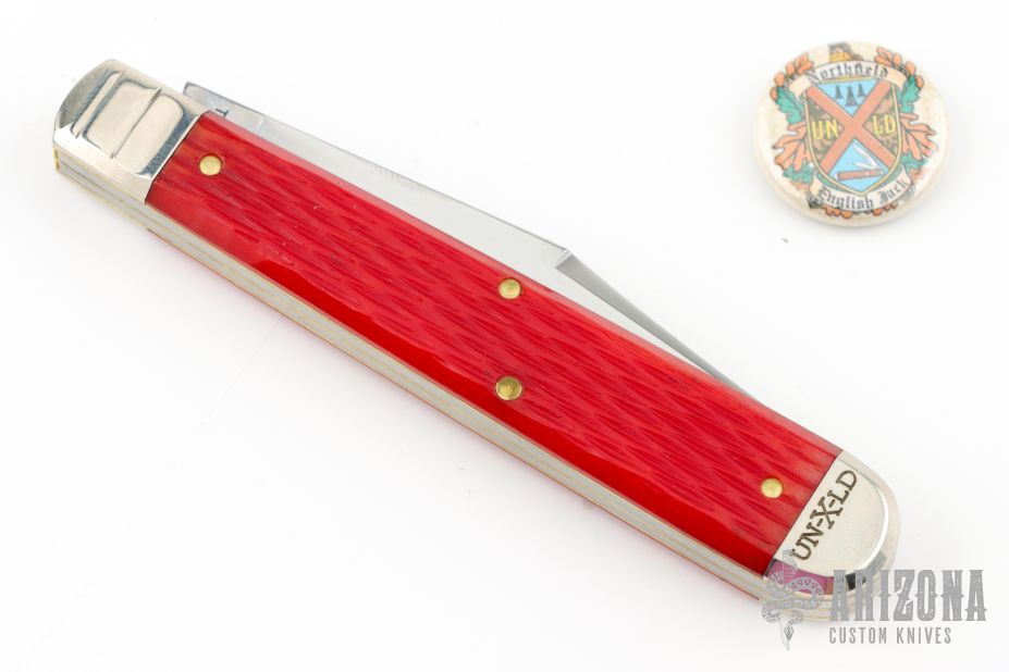 This English Jack by Northfield Knives features mirror polished blades with nail nicks. The handle has nickel silver pinched and fluted bolsters, Indian Paint Brush Jigged Bone covers with a nickel silver escutcheon, brass liners/pins. Has half stops. Comes with original tube. Excellent Condition.