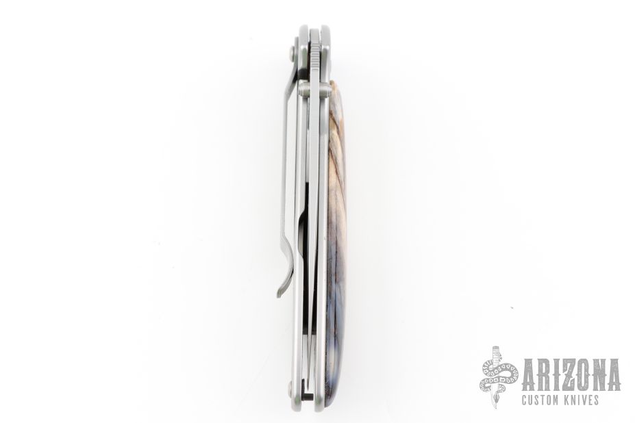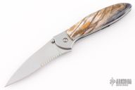 This Kershaw assisted opening flipper has been customized, it features a bead blasted partially serrated blade and back side of the stainless steel frame. mammoth tooth scale on front of handle, tip up or down reversible stainless steel clip. Nice lock up, blade seating and detent. Comes with a zippered case. Excellent Condition.