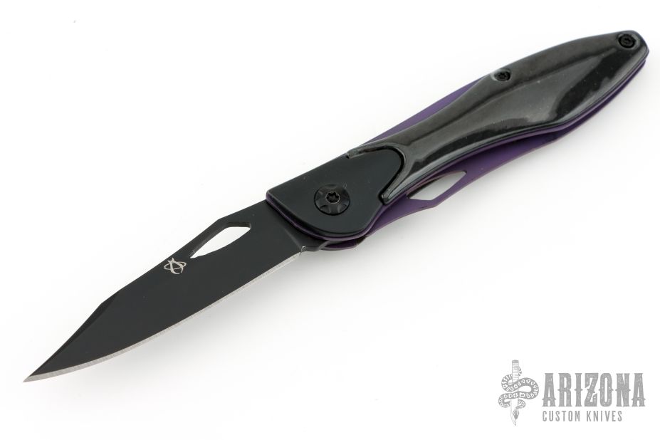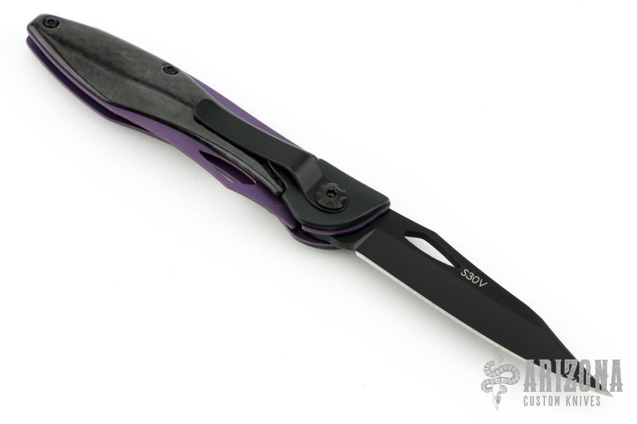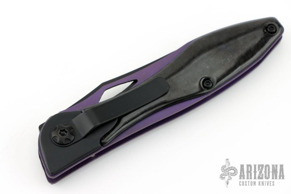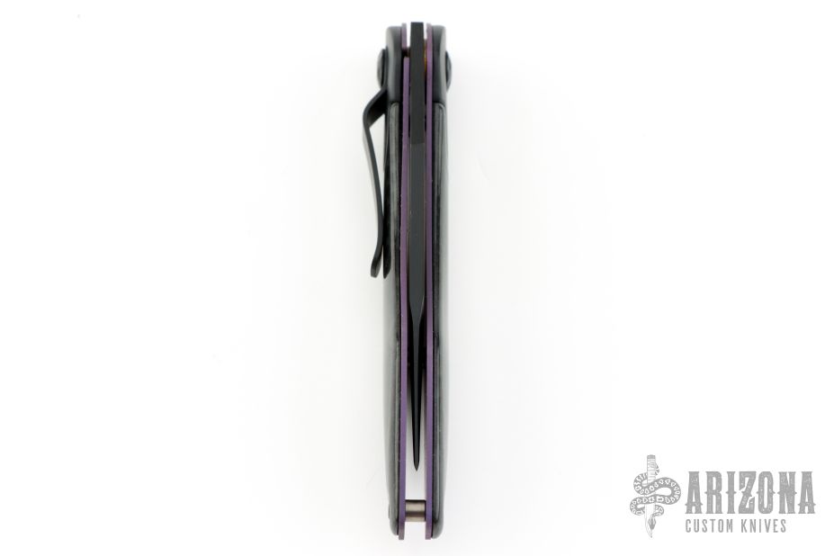 The flagship of the MT2 lineup. This dressy knife has a S30V blade like it’s brother, but it gets put through the black-oxide coating process to give it a stealthier appearance. To add to the equation, we coated the pivot with black oxide and added titanium liners with a special anodize process that fades from gray purple. The carbon fiber handles show just how classy this knife really is. The action is indicative of a far more expensive piece.