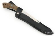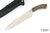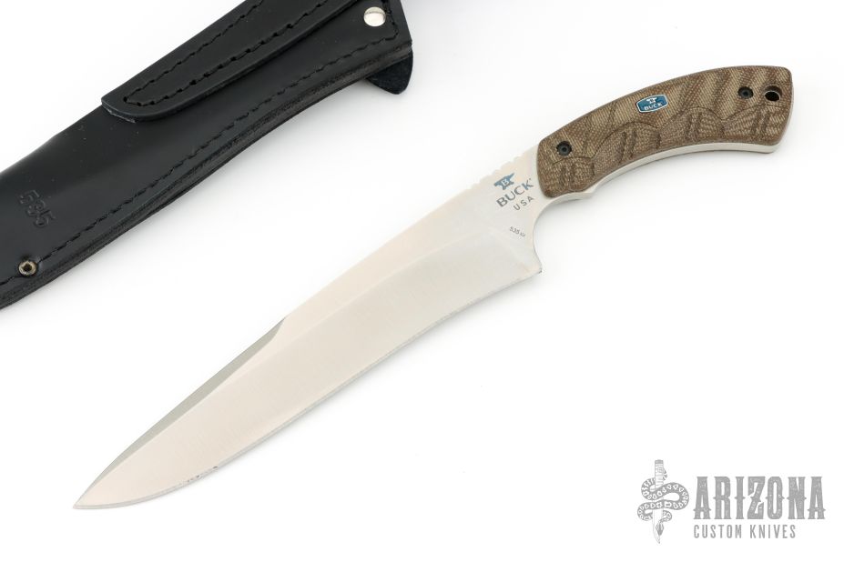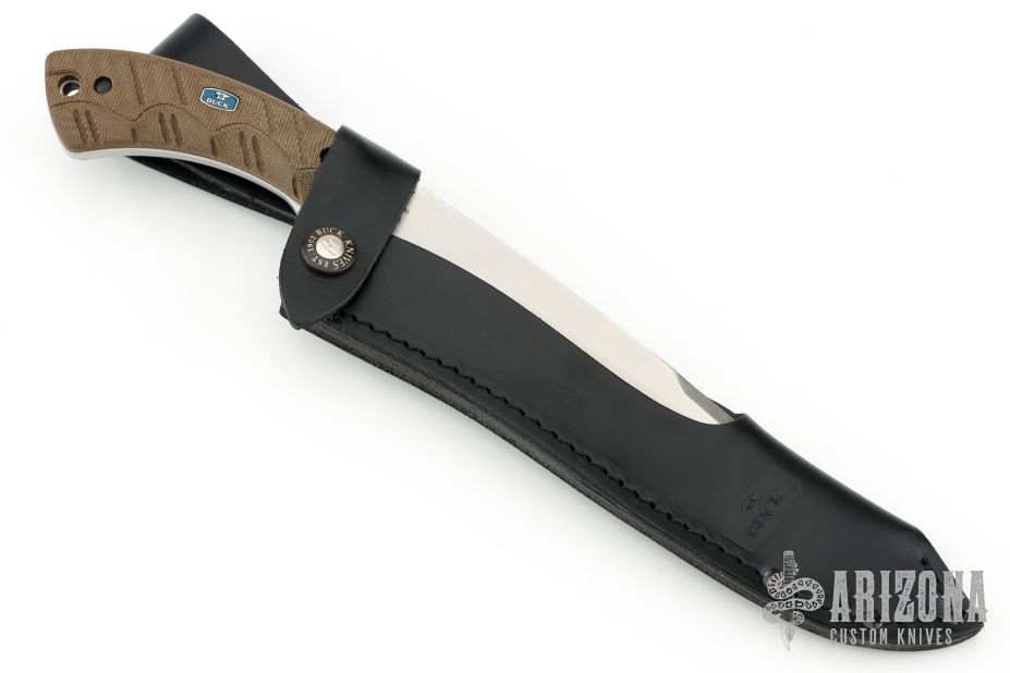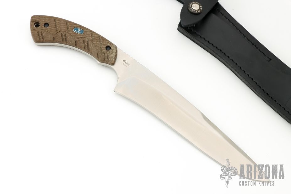 This Open Season Moose Skinner from Buck Knives features a satin finished blade with swedge and notched thumbrest. The handle is comprised of micarta covers over full tang construction. Lanyard hole in pommel. Includes leather sheath with belt loop and original box. Excellent condition.
