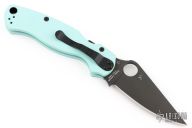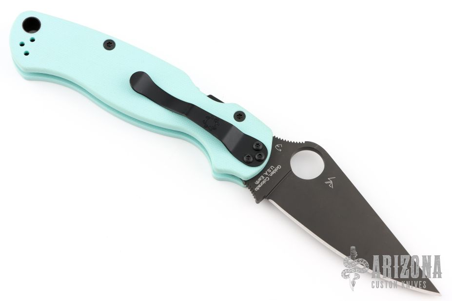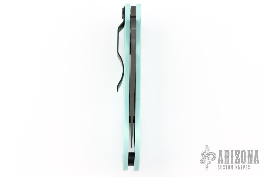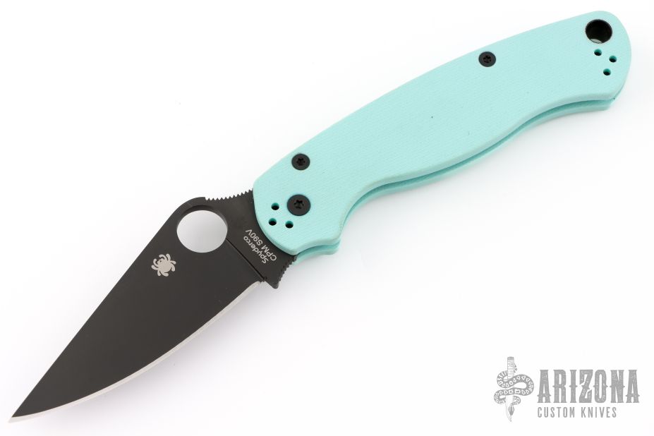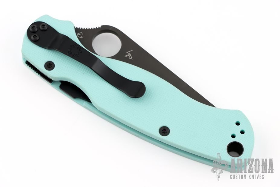 In this special edition of the Paramilitary 2, it comes with teal G10 handles instead of the normal FRN scales. G10 has great weather-resistant properties which give the handle a sure grip in any environment. The blade of the knife is DLC coated and the steel is upgraded from the normal S30V stainless steel to S90V.