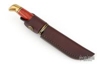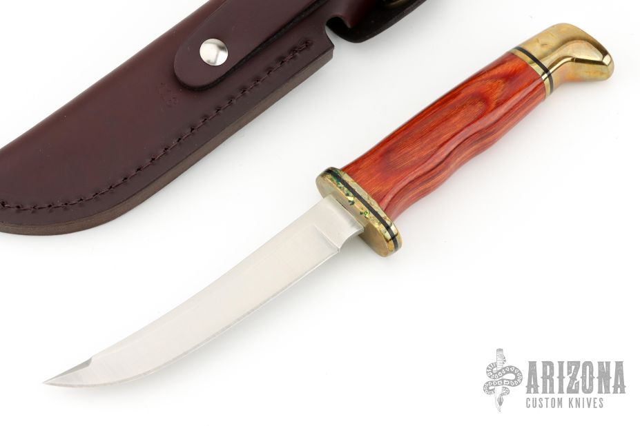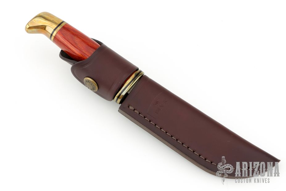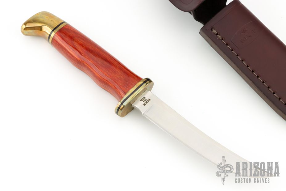 This knife by Buck features a satin finished blade with .119" blade stock and .701" blade depth, hidden tang construction. The handle has a brass guard and butt with rosewood grip. Comes with original box, papers and brown leather sheath. Has patina on the guard/verdigris. Excellent condition.