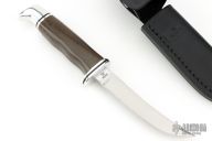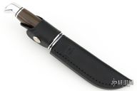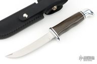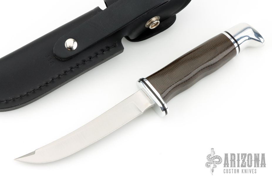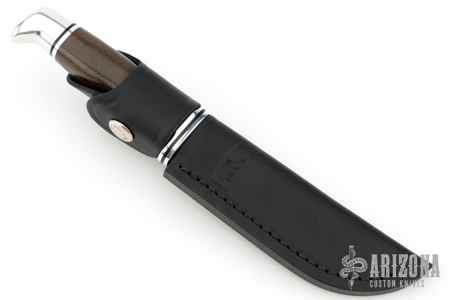 This knife by Buck features a satin finished blade with .119" blade stock and .701" blade depth, hidden tang construction. The handle has an aluminum guard and butt with micarta grip. Comes with original box, papers and black leather sheath. Excellent condition.