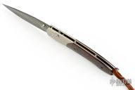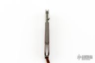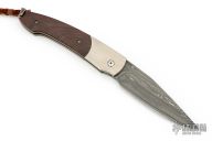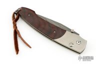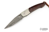 This B15 button lock folder by William Henry features a Mike Norris Ribbon Lace Damascus blade with single thumbstud with white topaz inlauy. The handle has a bead blasted titanium frame and Cocobolo covers. Comes with original box, sheath and COA. Excellent condition. 615-0085 4/20/2006
